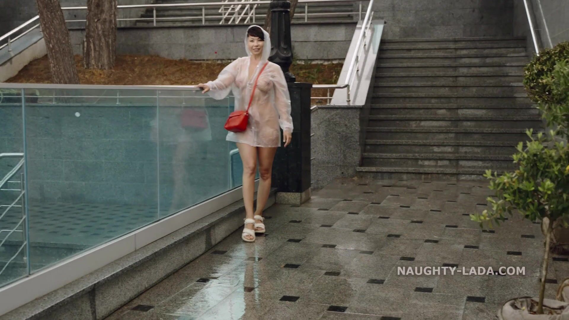 A walk in the rain in her new see through raincoat